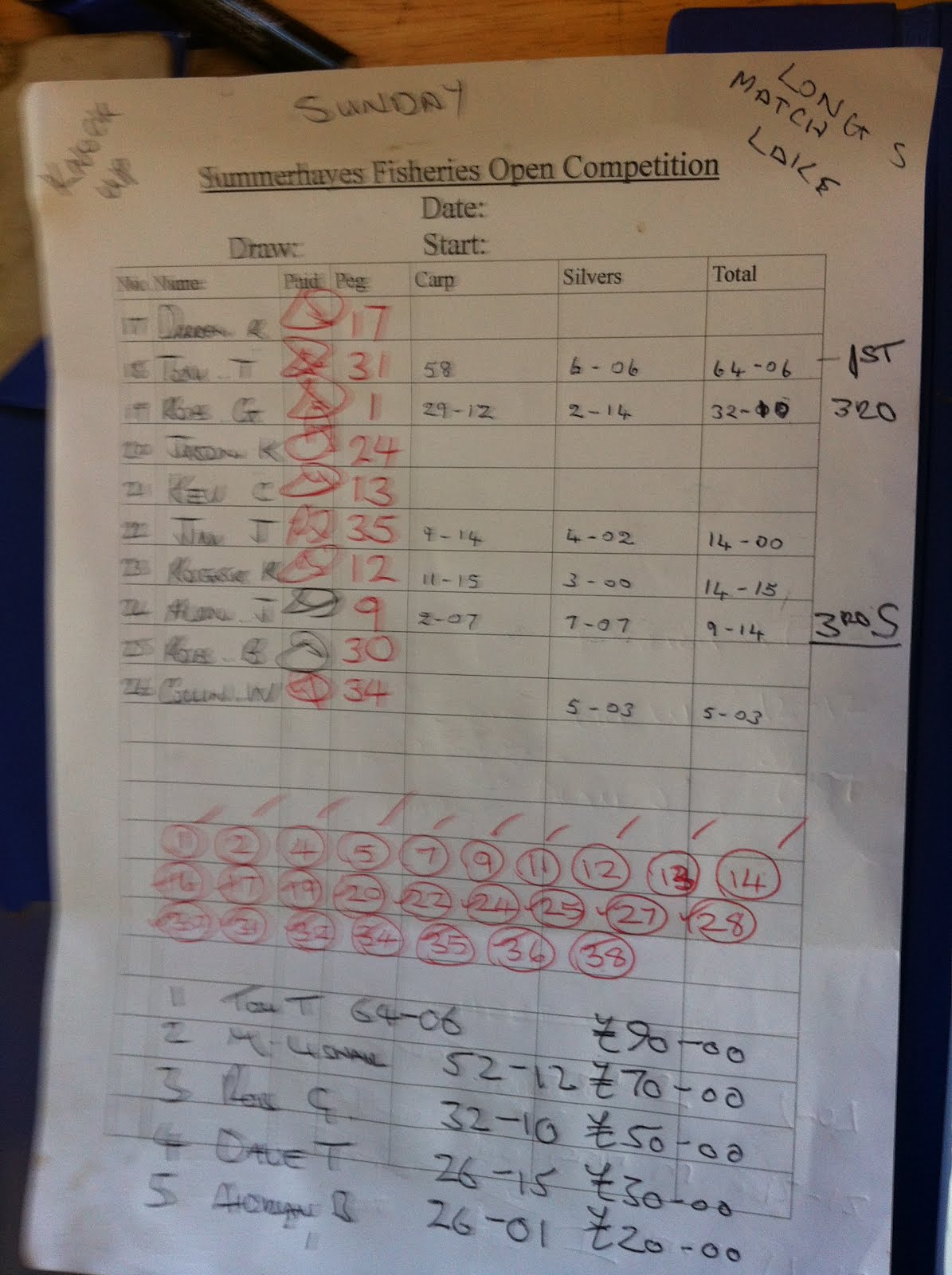 After last weeks disaster I was hoping for better things today at Summerhayes, it was on Long’s Match Lake again and the forecast was for a hot, sunny day. I picked Janders up and on arrival we could see there was a really good turnout (26 anglers in total). There were the usual venue experts in the form of Bruce Hunt, Adie Bishop and the Wickhams plus some right stars (muggers) in the shape of Bob Gullick and Tom Thick who always seem to do well here. Just after I got out the car a chap came and introduced himself to me, it turns out he’s Ivan Currie who follows my blog and also writes an excellent blog himself, have a look, a very good read http://ivansangle.blogspot.com/ It was his first time here and he was a really nice bloke, it’s always nice to meet fellow bloggers!