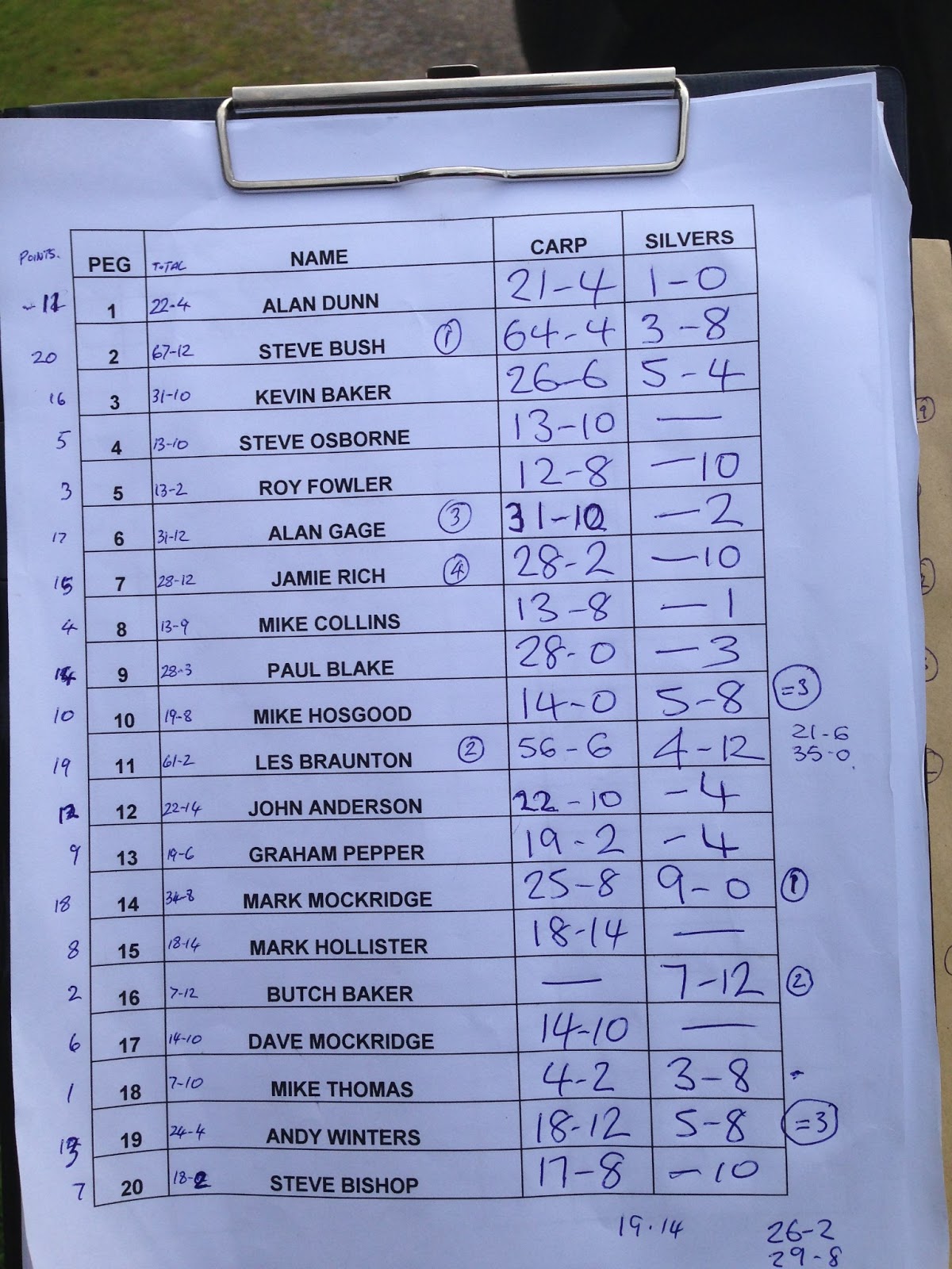 The last few pegs had struggled with Dave M weighing 14lb 10oz, last weeks winner, Mike T only had 4lb 2oz of carp and 3lb 8oz of silvers, Chilly had 18lb odd of carp and 5lb 8oz of silvers to put him joint third and Bish had 17lb 8oz in peg 20. So I’d actually hung on to fourth in the carp and picked up £30 to end my barren run. Still can’t get my head round the silvers though!