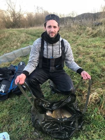 It got really cold in the last half an hour and when I went to pack up, the toss pot on my other rig was frozen to the ground! Frank shouted up to ask how many I had, I told him and he said he’d ended up with fifteen and Jake had twenty four, I knew they’d beaten me but hopefully I had enough to hang on to third place. As Steve hadn’t caught and Harry chucked back, we walked up to Jake and after several weighs his total was 65lb 7oz, Frank had 36lb 13oz which included some good fish, Bill didn’t weigh and then my ten carp (and a rudd) went 22lb 10oz and I ended up third and picked up £20.