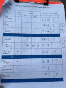 Nick also had a lovely net of skimmers and chub for 18lb 2oz, Terry had caught really well on the pole down the edge towards the end to weigh two carp for 11lb 6oz and three chub and bits for 10lb 3oz and a 21lb 9oz total to win the section and the match, he’d also lost a couple of carp. Leighton was the last peg in that section and had struggled for a few small fish and chucked back.